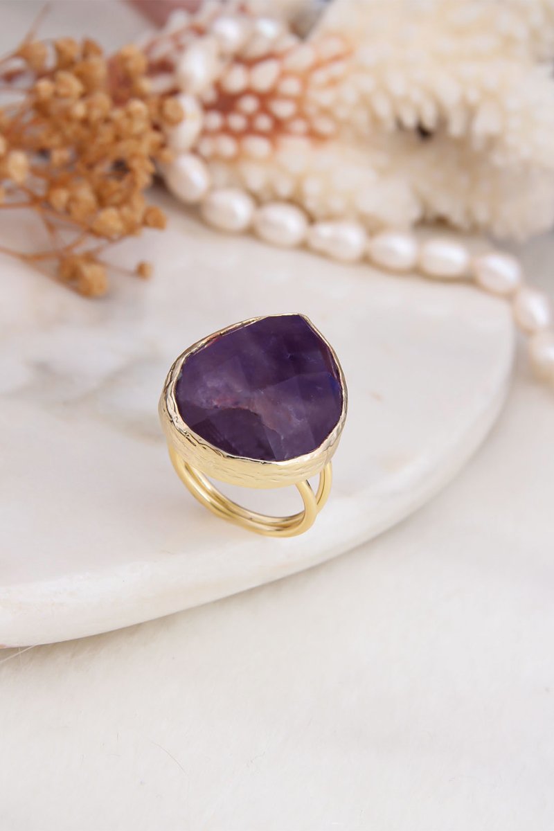 Verstelbare ring van doublé geelgoud ingelegd met 1 amethist.