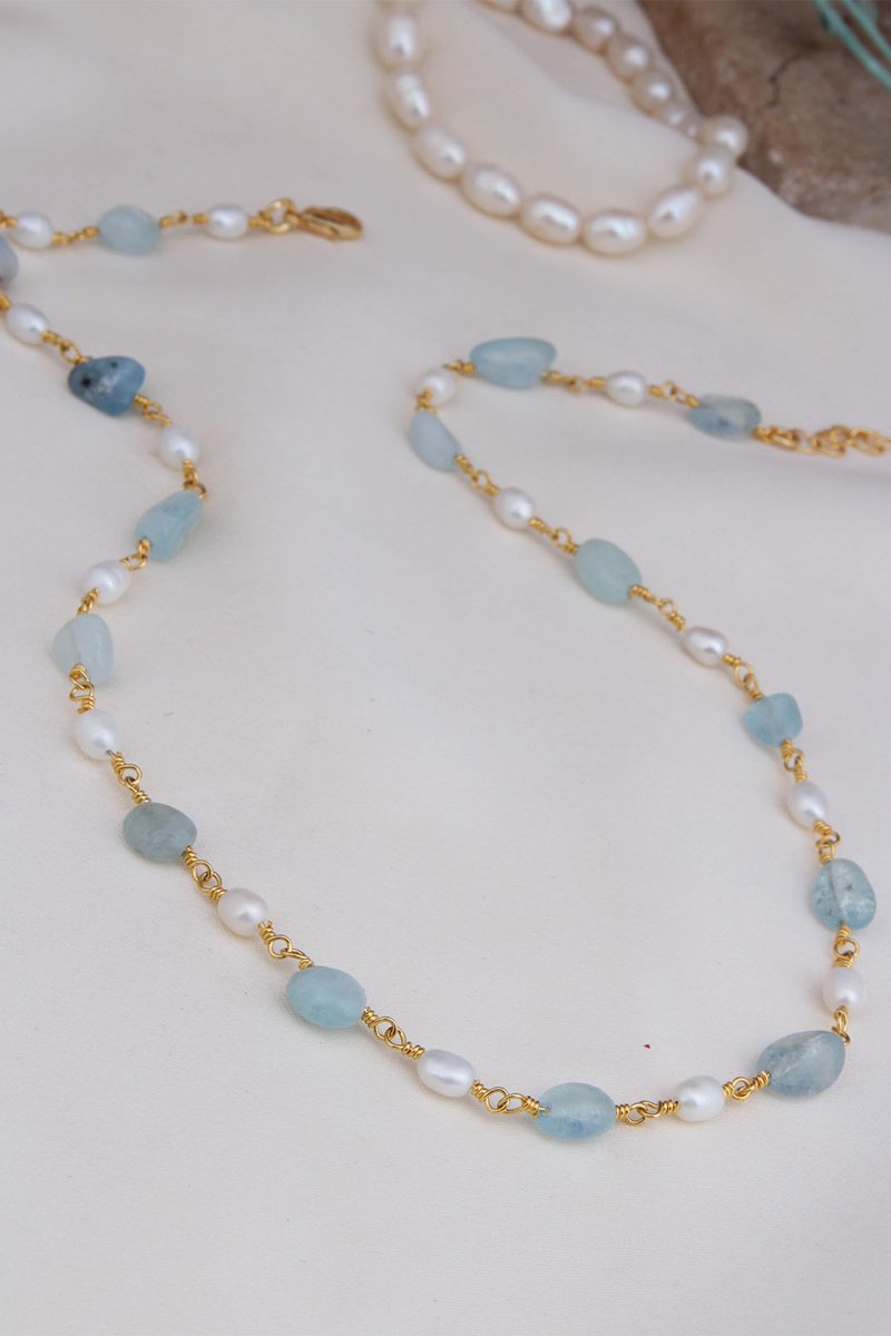 Ketting ingelegd met aquamarijnen en kunstparels.