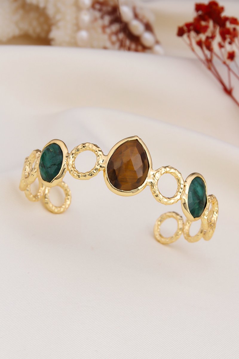 Open armband van doublé geelgoud ingelegd met 2 agaten en 1 tijgeroog.