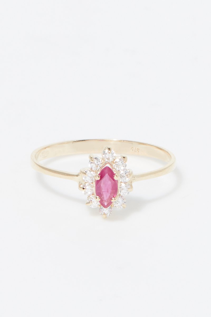 Ring van geelgoud ingelegd met 1 robijn en zirkonia's.