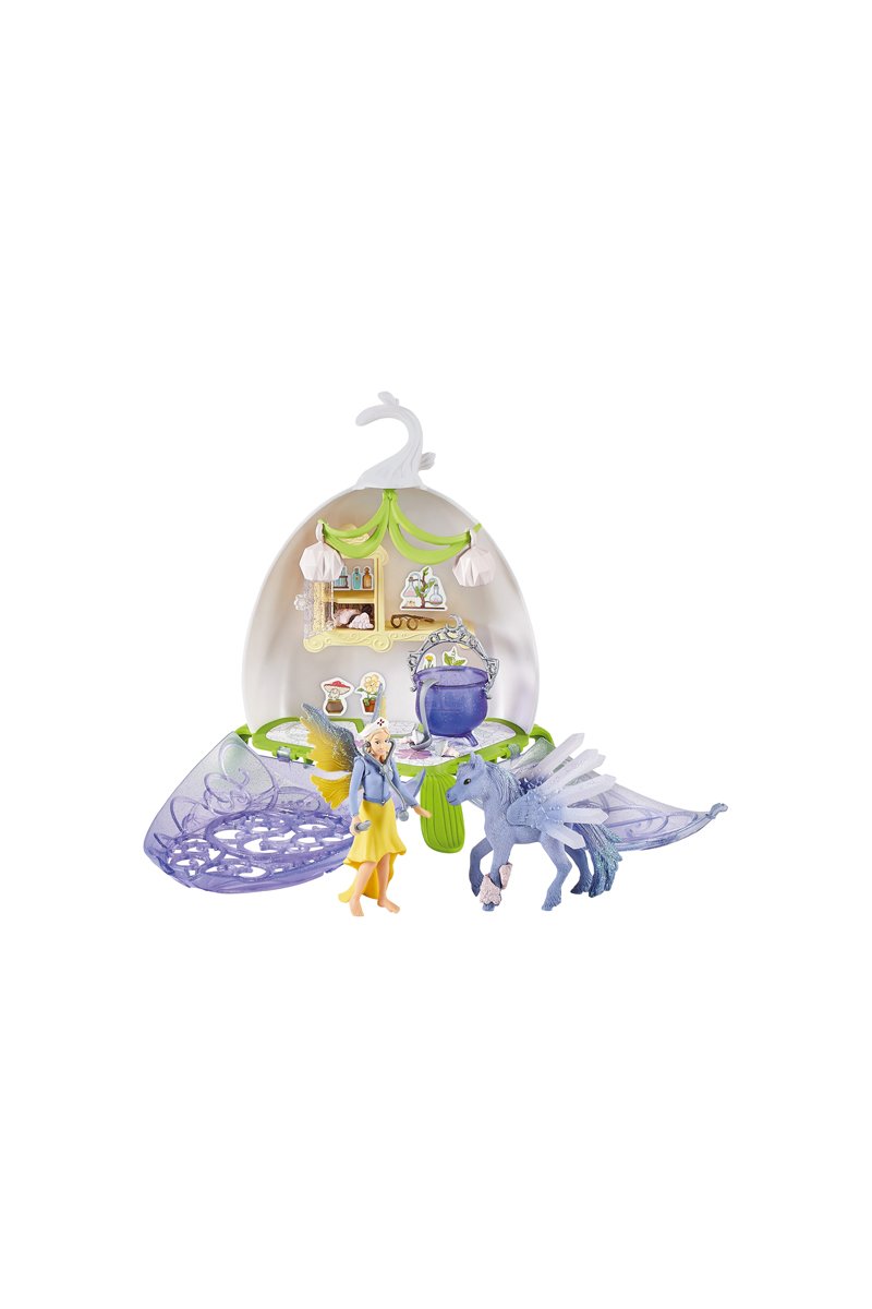 De nieuwe Schleich® bayala® "Magical Veterinarian's Office" bloem is op maat gemaakt voor de veterinaire elf Sera. Als ze de bloem opent, zet ze eerst haar verpleegsterspet op en neemt ze haar stethoscoop mee, waarmee ze haar patiënten ausculteert. Daarna brouwt ze in haar ketel geneeskrachtige middelen op basis van paddenstoelen die ze met haar pollepel omroert.