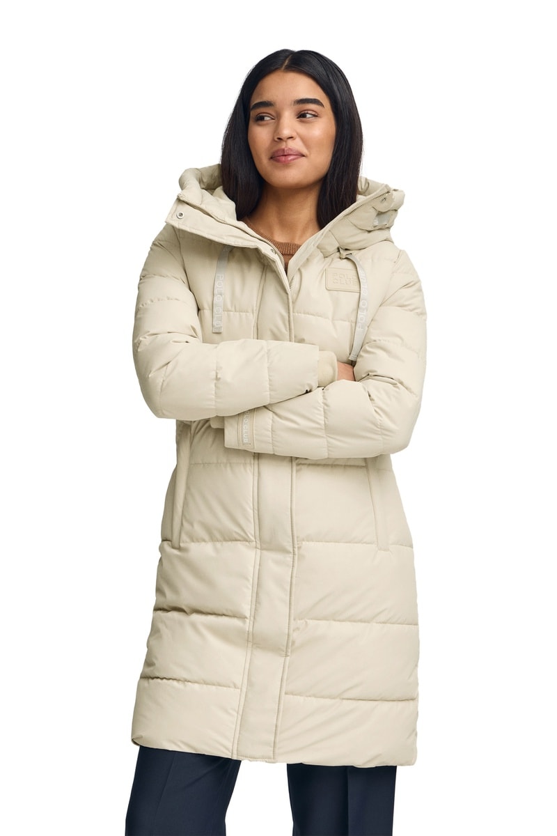 Lange gewatteerde jas met capuchon en trekkoorden.