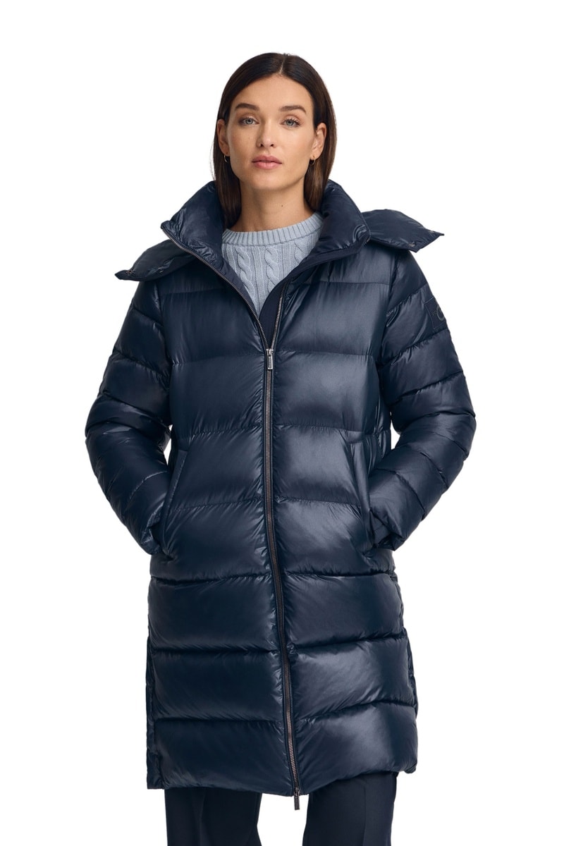 Lange gewatteerde jas met capuchon - Marineblauw