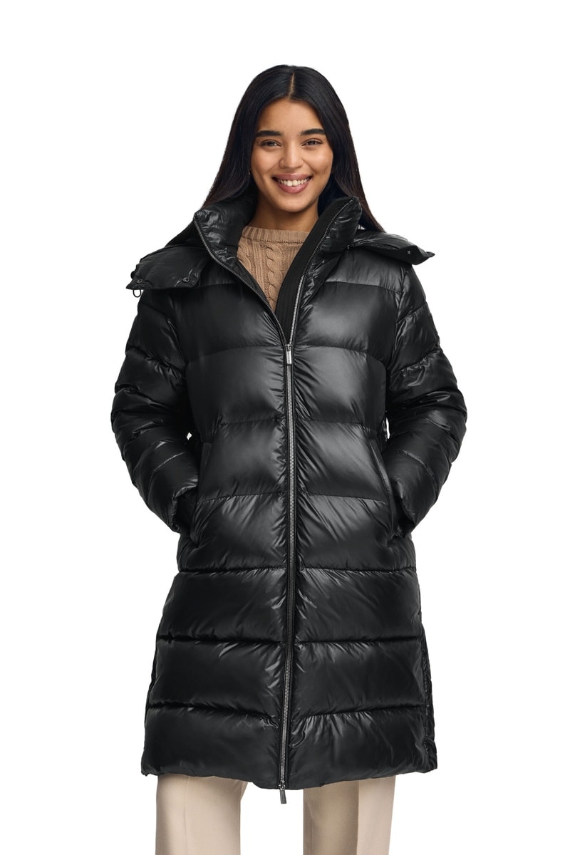 Lange gewatteerde jas met capuchon - Zwart