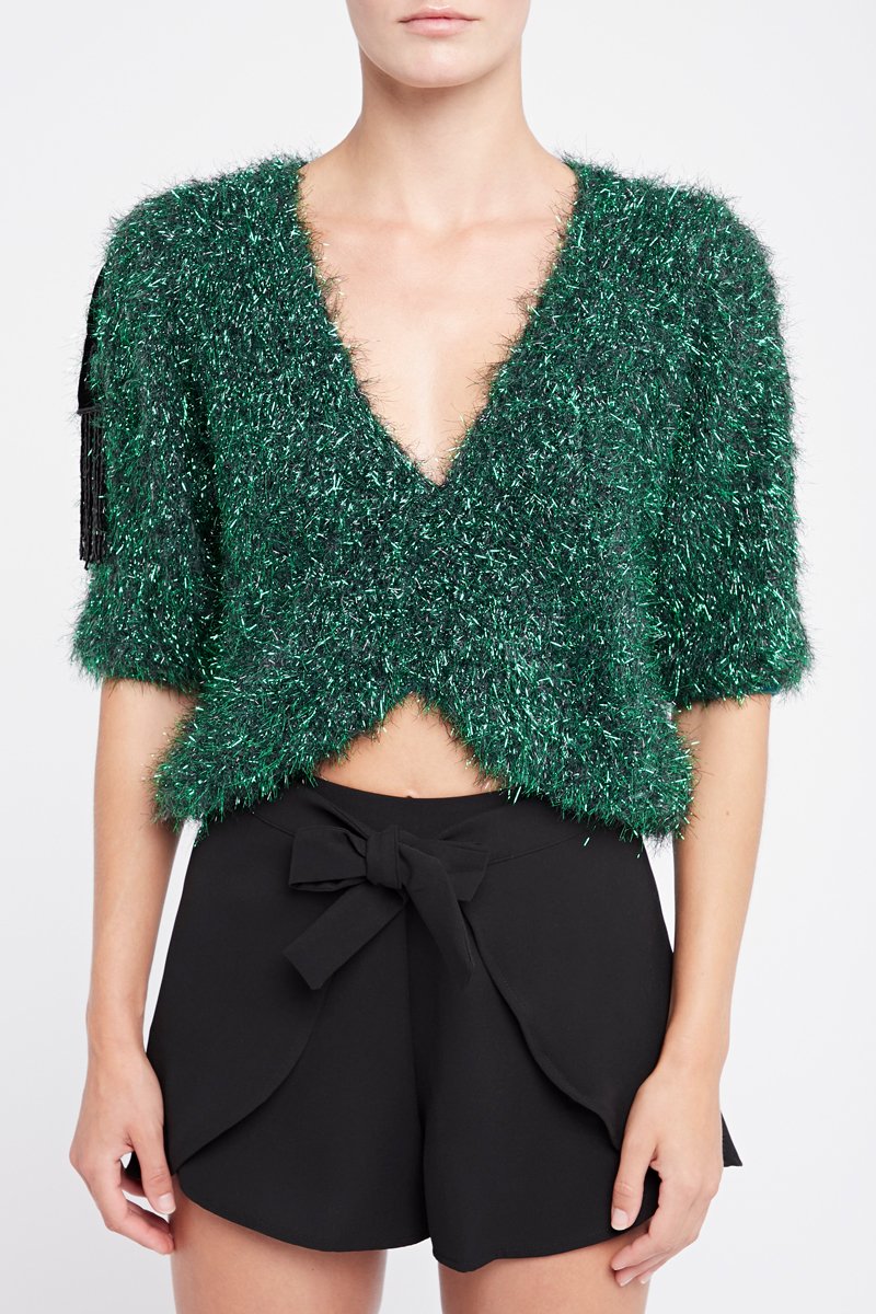 Driekwart mouwen met logo in reliëf en franjes.