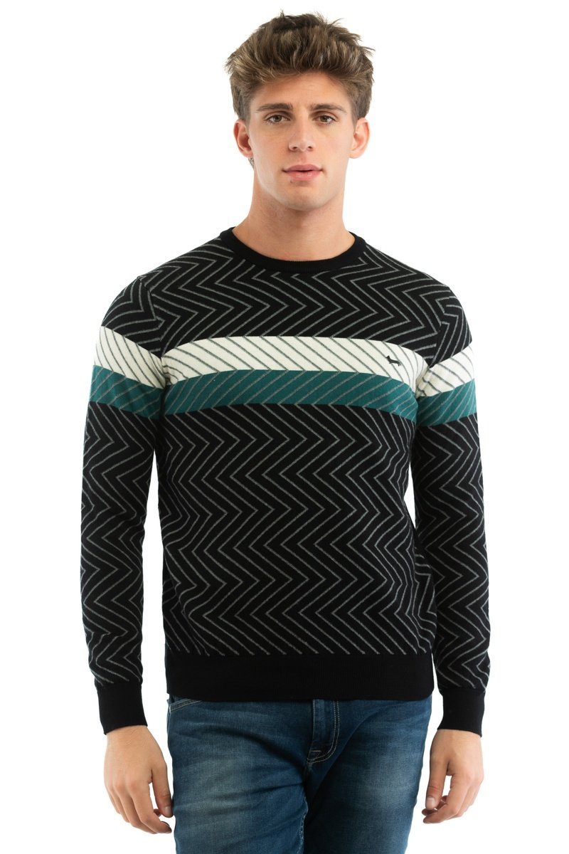 Streepmotief en chevronmotief op de mouwen en aan de voorkant.
