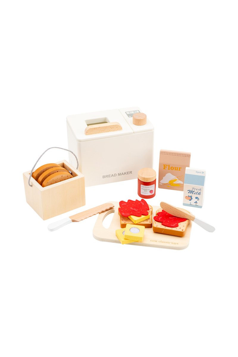 Deze set bevat een nepbroodmachine, een houten doos met 5 sneetjes brood, een pot aardbeienjam, boter, een pak melk en een zak bloem.