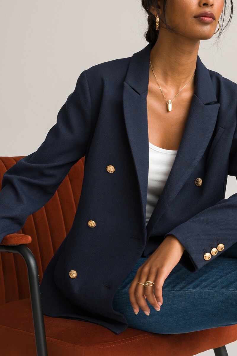 Jasje in blazer stijl. Klassieke kraag. Borstzakje. Lange mouwen met knopen. Uitsnijdingen. 2 zakken aan de voorkant. Split aan de achterkant.