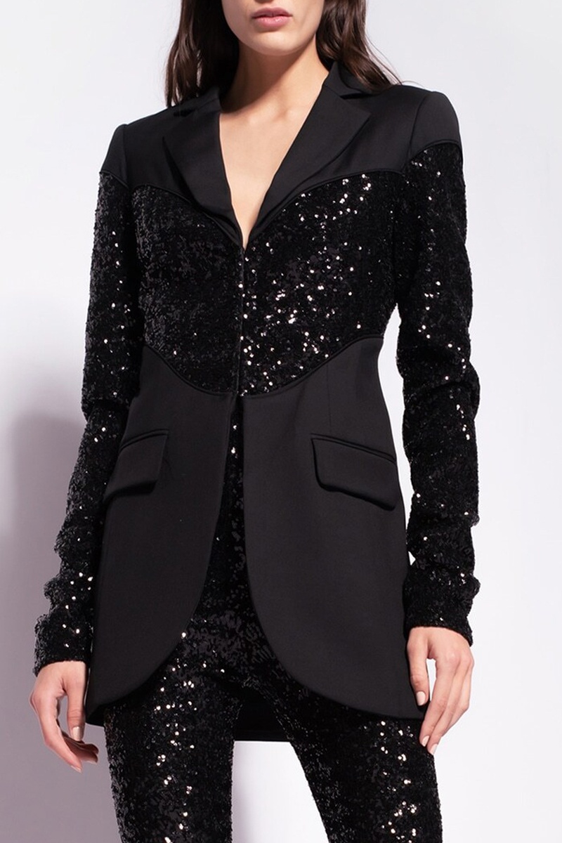 Details met pailletten op de mouwen, aan de voorkant en aan de achterkant.