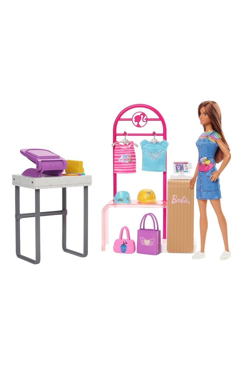 De kinderen kunnen hun eigen verhaal bedenken in de mode-industrie met deze Barbie-pop en de Boutique Créations set!
