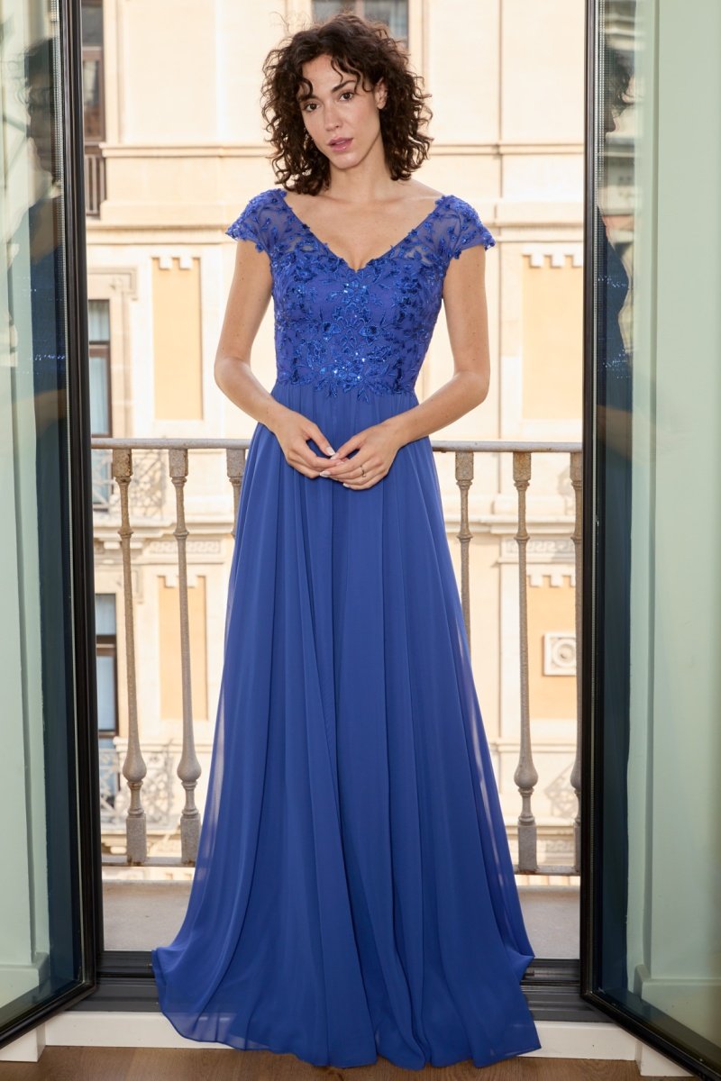 Lange jurk met kapmouwen.
