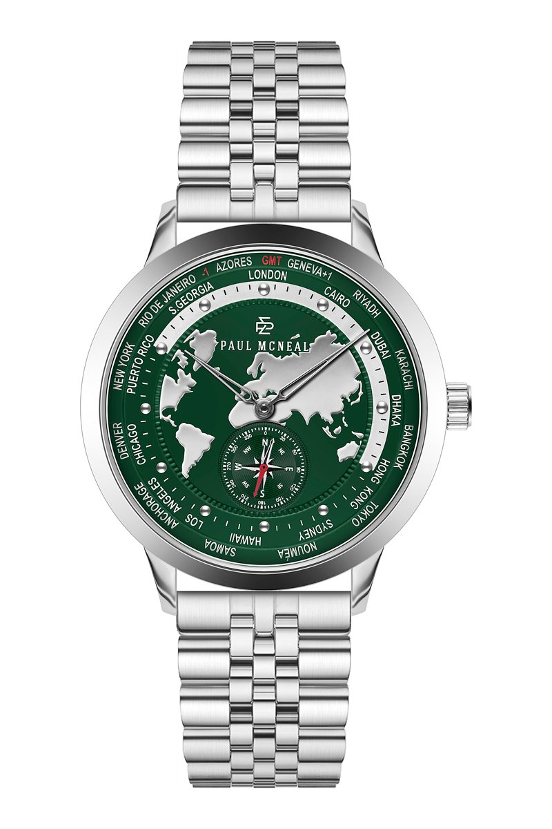 Stalen Quartz Horloge - GMT-functie - Zilverkleurig en Groen - Paul McNeal