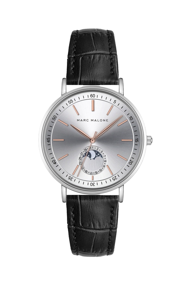 Leren Quartz Horloge - Maanstandweergave - Zwart en Zilverkleurig