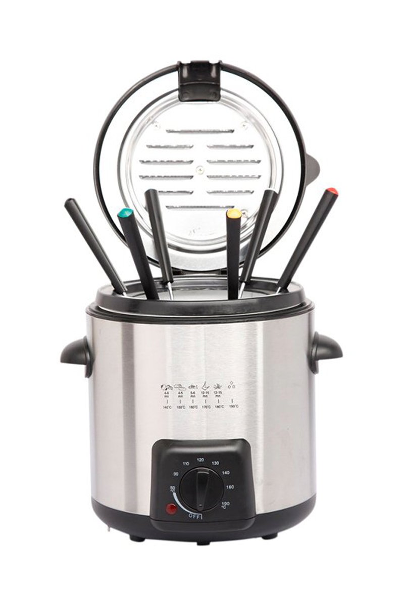 Inclusief 6 fonduepinnen en frituurmandje met afneembaar handvat.