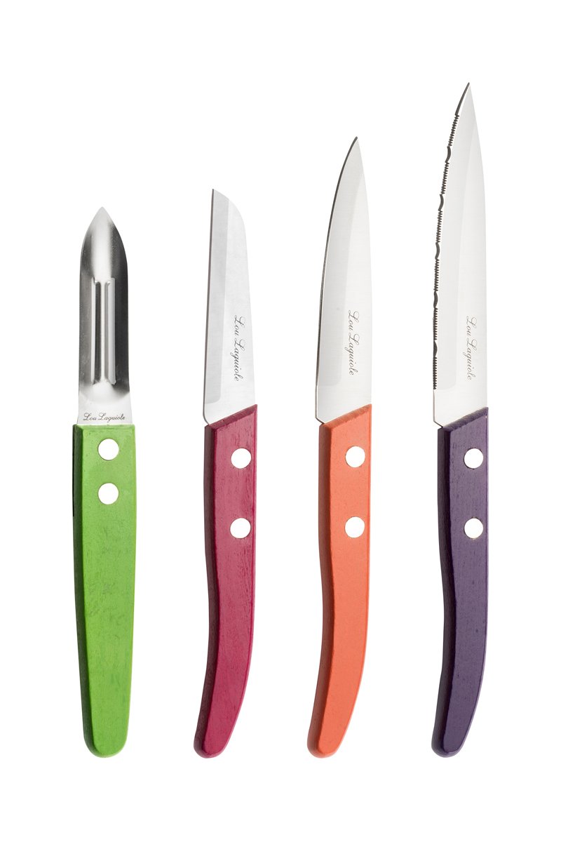 4 messen van roestvrij staal 13/10 met steel van hout bevat: