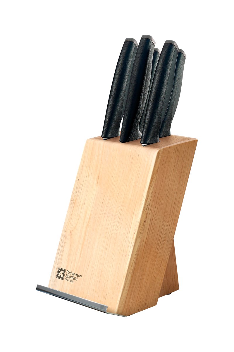 Messenblok van hout met 5 messen van roestvrij staal 13/10 bevat: