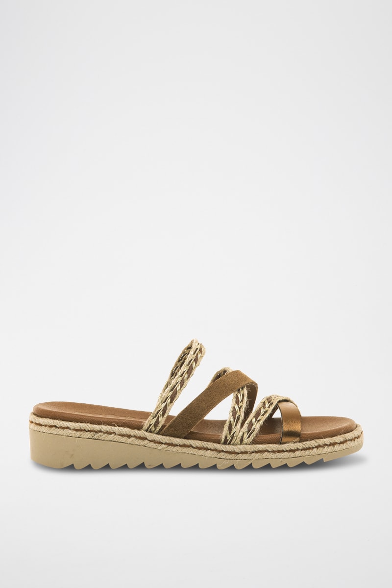 Meerdere gekruiste bandjes waarvan 3 met gevlochten effect, 1 bandje met metallic effect en 1 van kunstnubuck aan de voorkant.