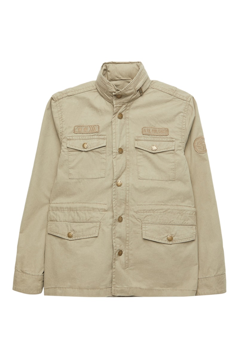 Geborduurd embleem met belettering op de linkermouw en aan de voorkant.