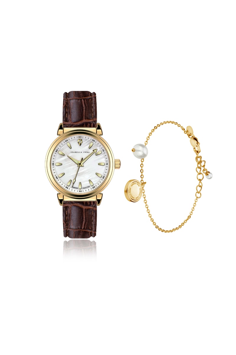 Set Doublé Geelgoud, Diamanten en Parelmoer Ion Leren Quartz Horloge en Armband Barbara