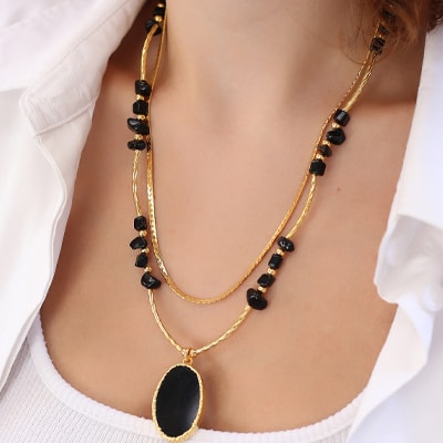 Ketting - Messing Doublé Goud. Onyx & Agaat