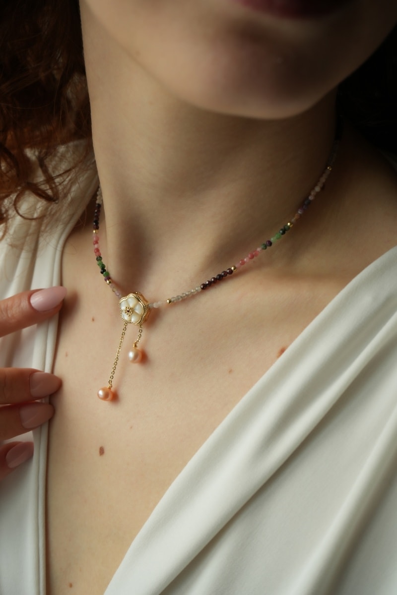 Materiaal: messing doublé geelgoud, koper, toermalijnen en kunstparels
