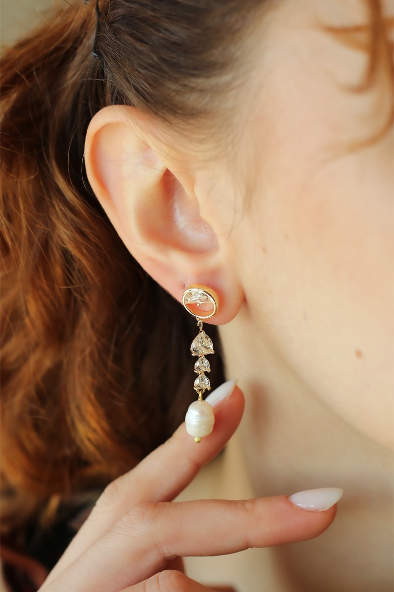 Hangende oorbellen ingelegd met zirkonia’s en cultivéparels.