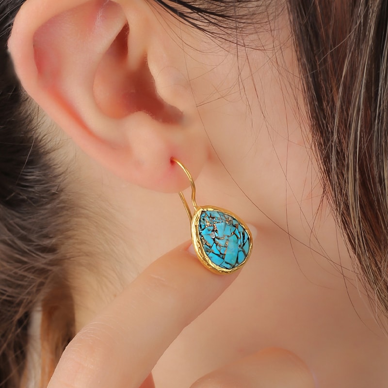 Val voor deze oorbellen van messing doublé geelgoud, verfraaid met turkooizen in schitterende kleuren. Elegant en licht, ze zullen een vleugje glamour en verfijning aan al jouw outfits brengen!