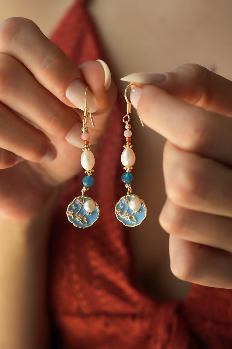 Hangende oorbellen ingelegd met 3 zirkonia's en 2 kunstparels.