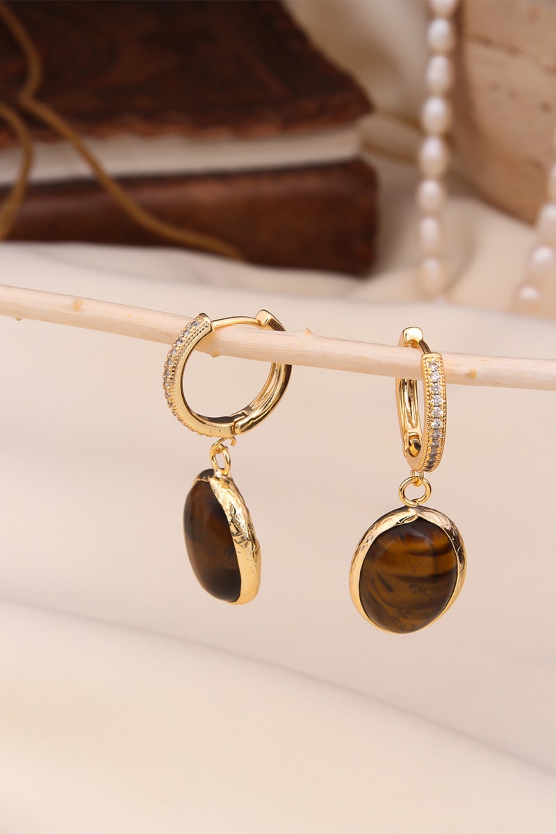 Hangende oorbellen ingelegd met zirkonia's en tijgerogen.