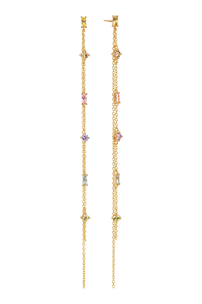 Hangende oorbellen van zilver doublé geelgoud ingelegd met 5 zirkonia's.