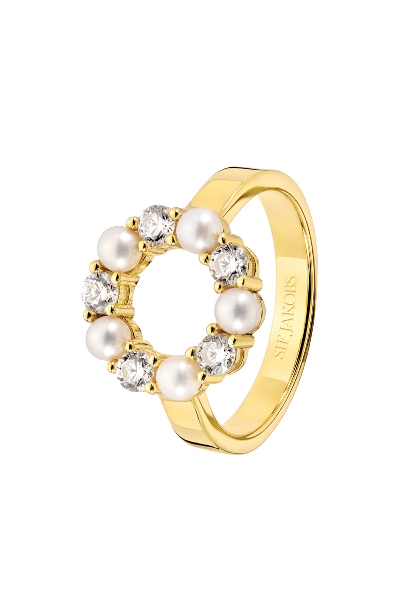 Ring van zilver doublé geelgoud, 5 cultivéparels en zirkonia's.