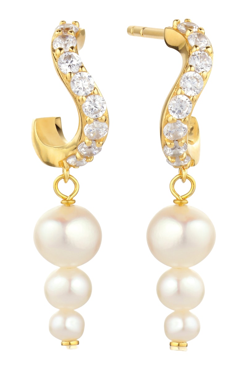 Hangende oorbellen van zilver doublé geelgoud ingelegd met 3 cultivéparels en zirkonia's.