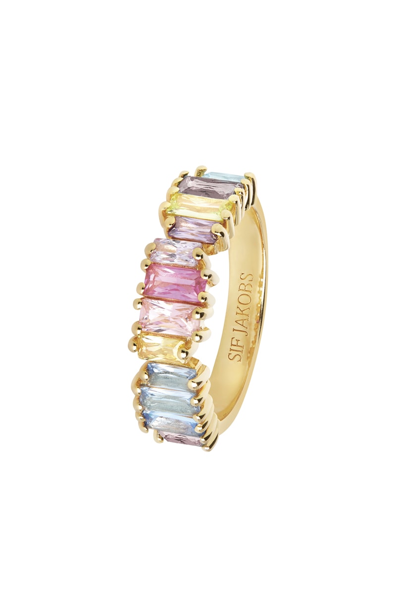 Ring van zilver doublé geelgoud ingelegd met zirkonia’s.