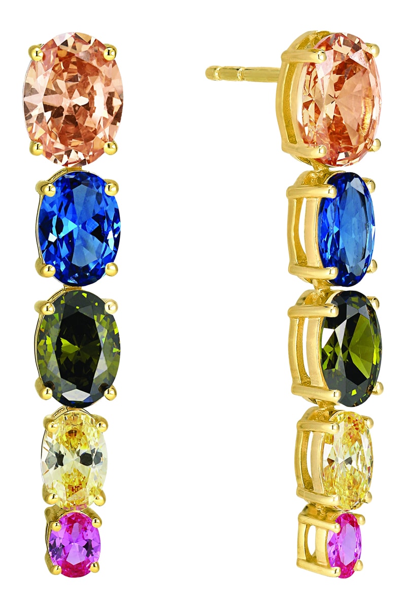 Hangende oorbellen van zilver doublé geelgoud ingelegd met 5 zirkonia's.